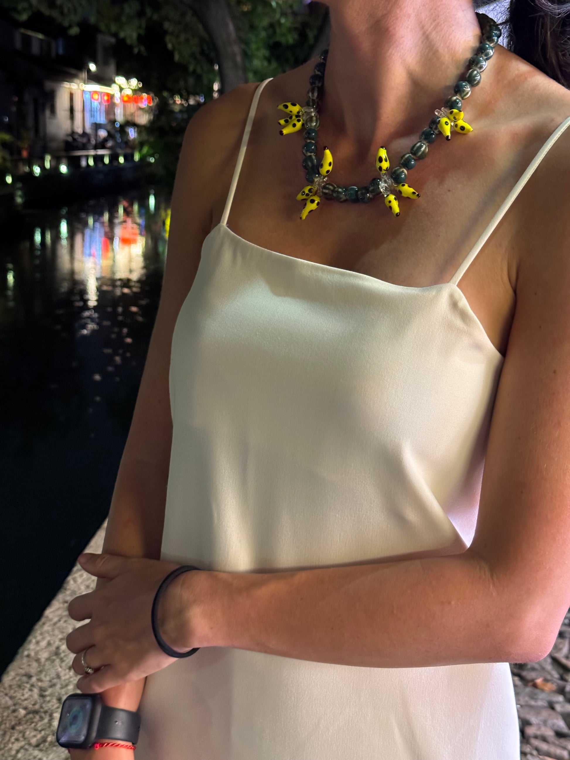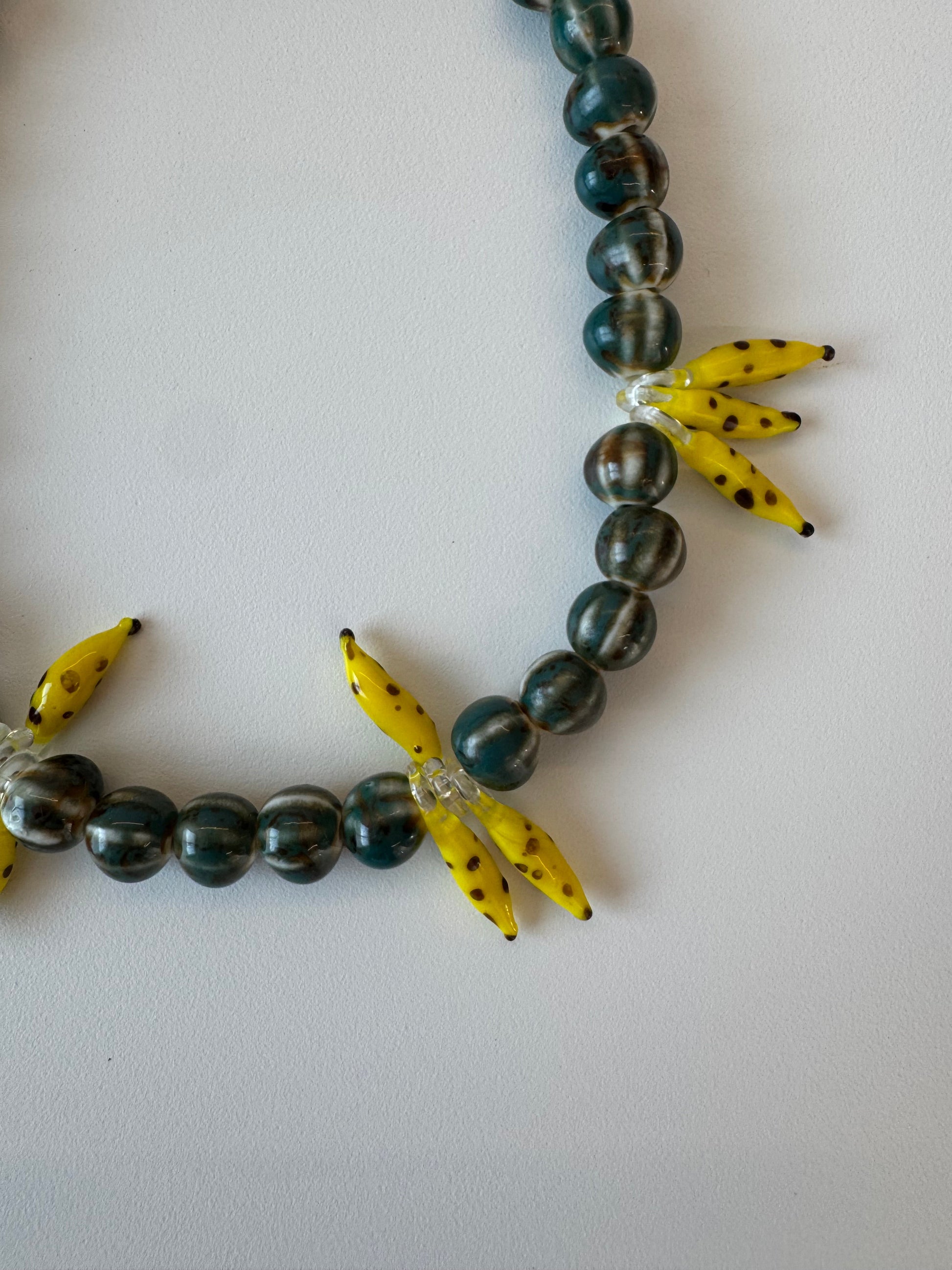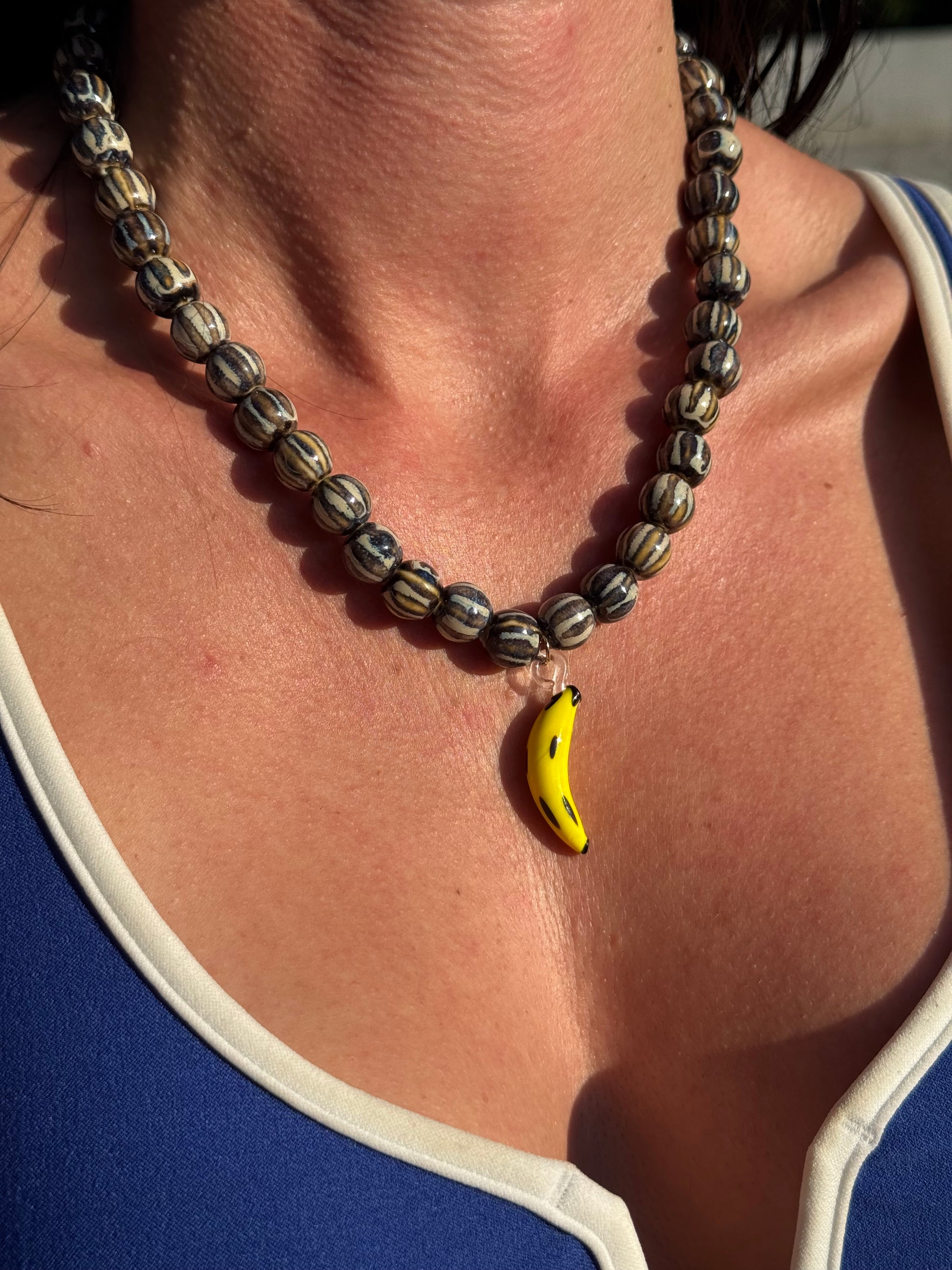 Collar artesano elaborado con cuentas de cerámica pintadas en color gris o verde, acompañada de uno o varios charms en forma de plátano en cristal soplado. Una pieza divertida y con carácter, ideal para añadir un detalle original y distintivo a tus looks.
