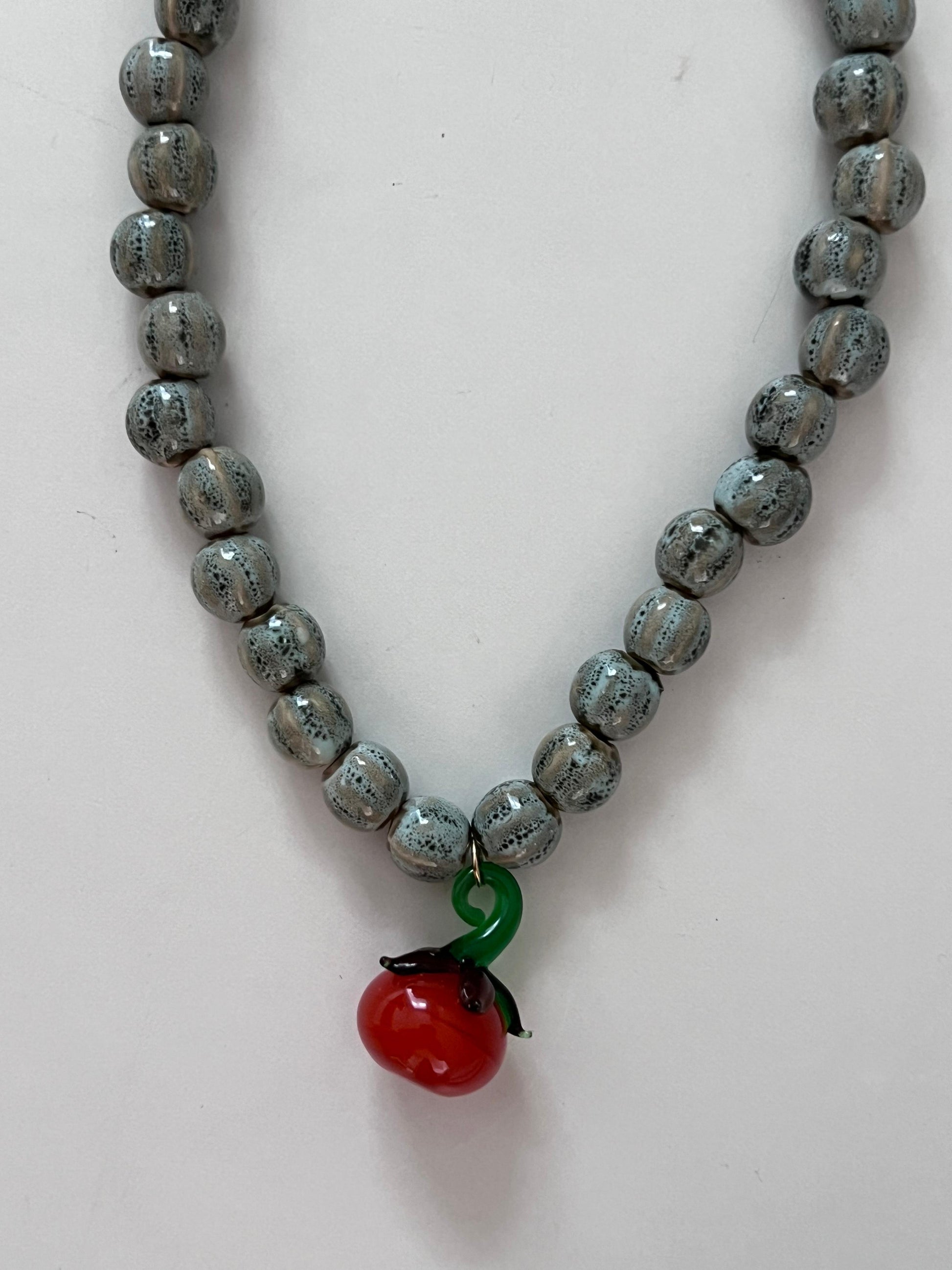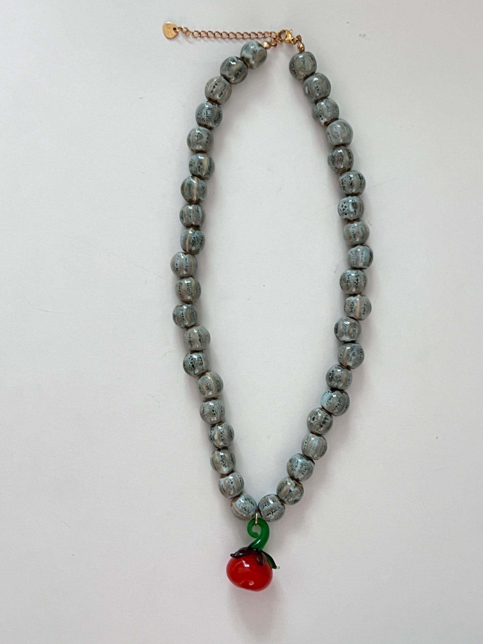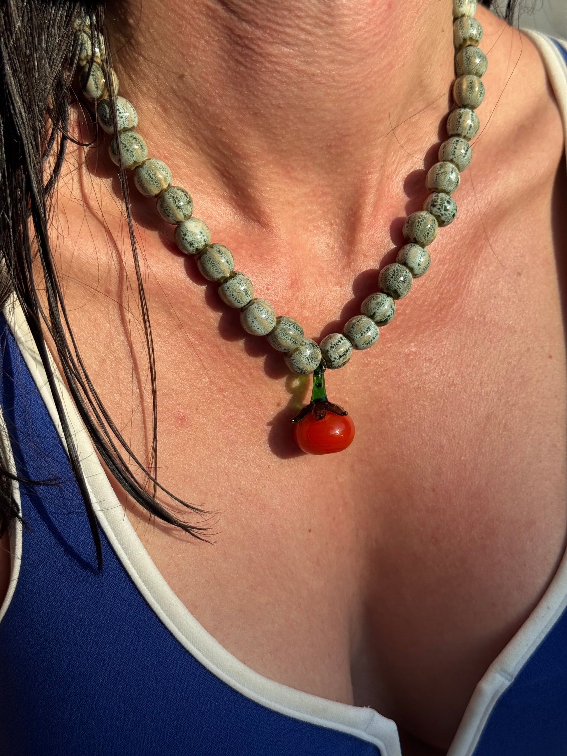 Collar artesano elaborado con cuentas de cerámica pintadas, acompañado de un charm en forma de tomate en cristal soplado. Una pieza con encanto y personalidad, perfecta para aportar un detalle original y distintivo a cualquier look.