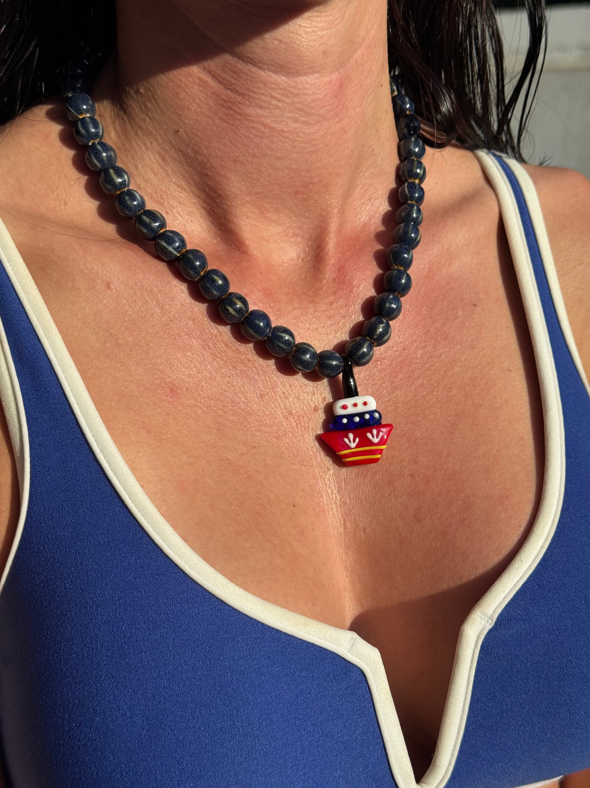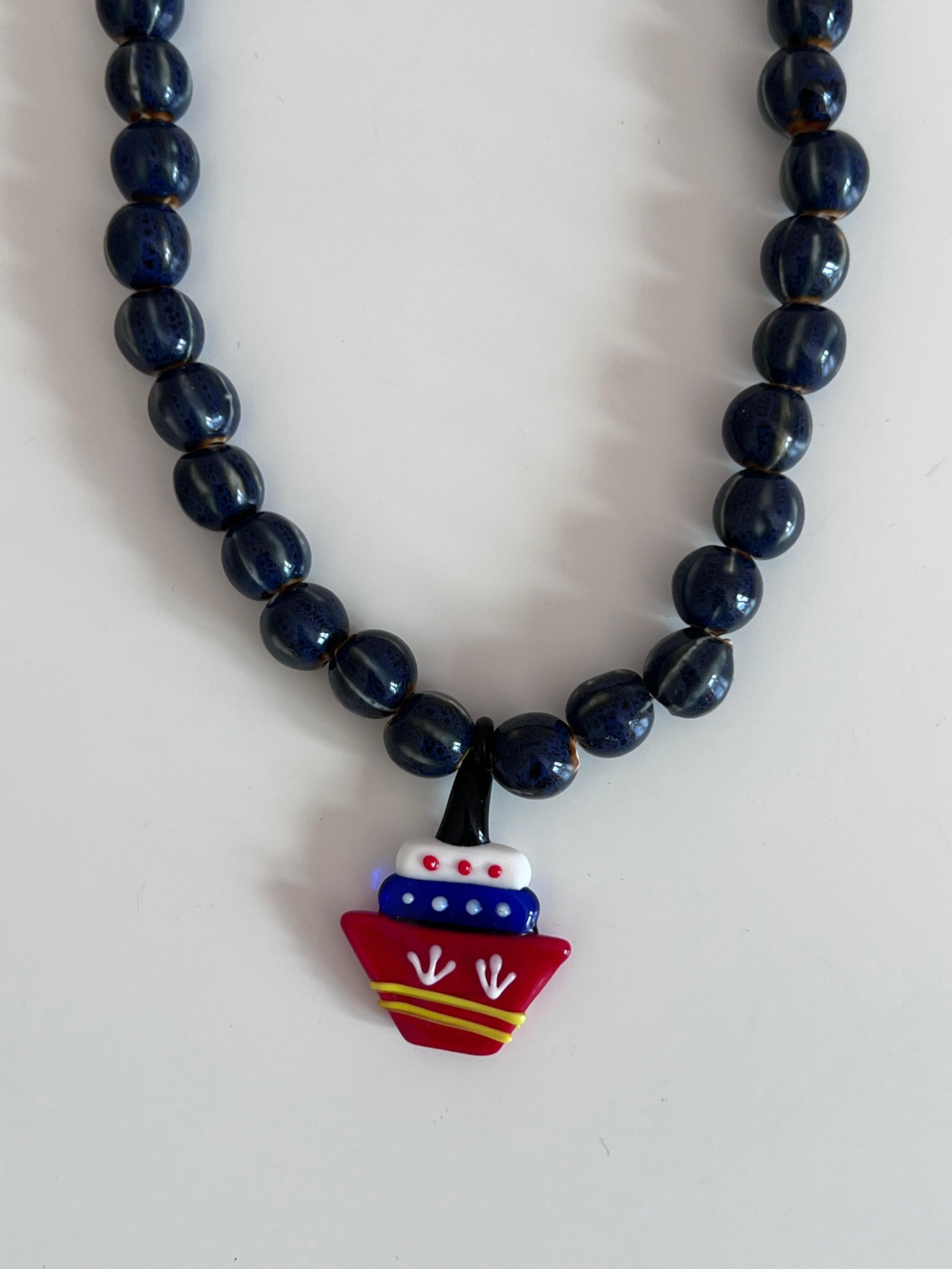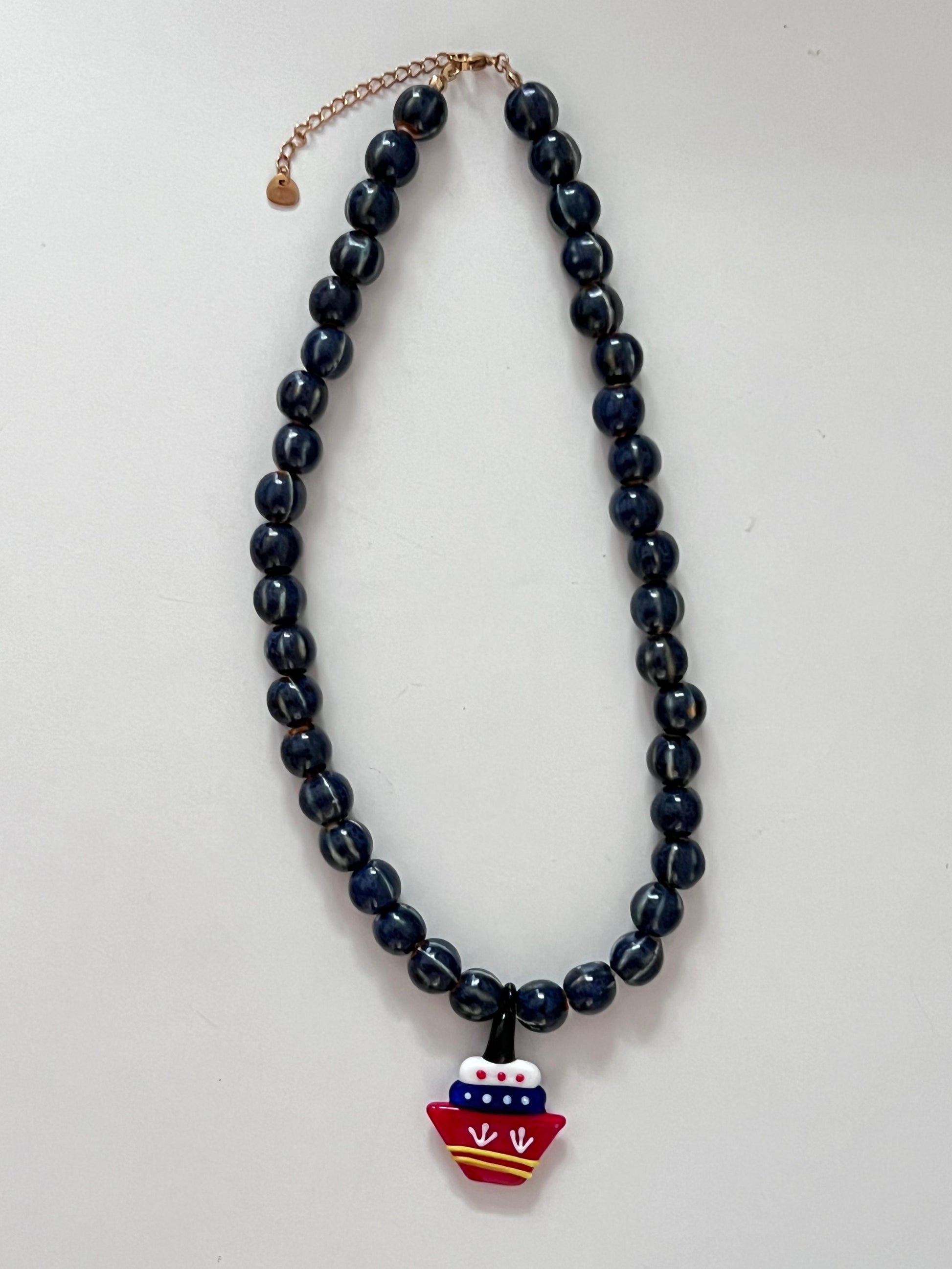 Collar artesano elaborado con cuentas de cerámica pintadas, acompañado de un charm en forma de barco en cristal soplado. Una pieza con encanto y personalidad, perfecta para aportar un detalle original y distintivo a cualquier look.